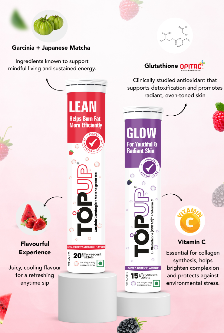 Topup Glow combines Glutathione and Vitamin C, two powerful antioxidants known for their skin-brightening and anti-aging properties. Unlike other skin tablets, it not only enhances skin radiance but also strengthens immunity, providing a holistic approach to skin and overall health.