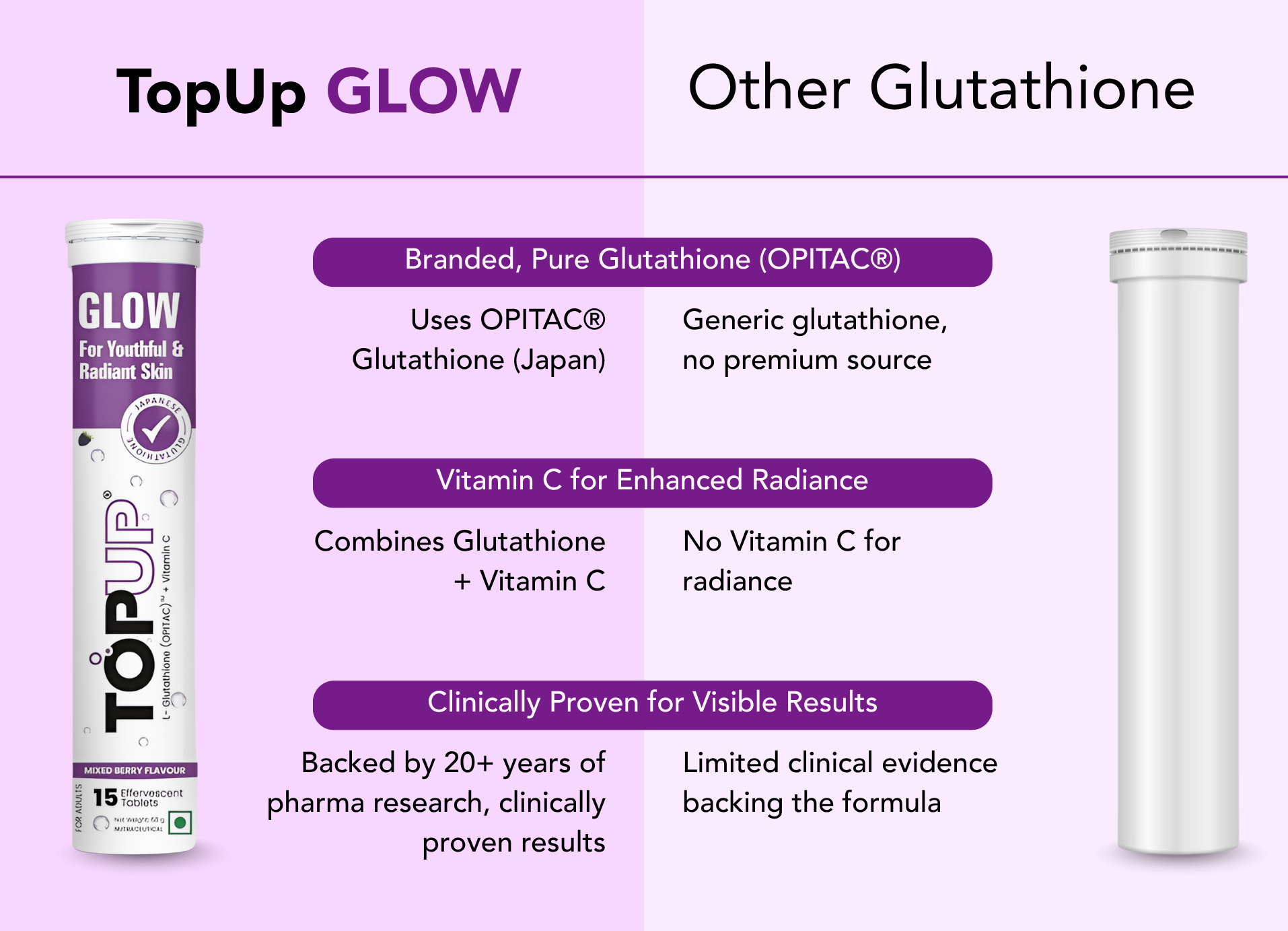 Topup Glow combines Glutathione and Vitamin C, two powerful antioxidants known for their skin-brightening and anti-aging properties. Unlike other skin tablets, it not only enhances skin radiance but also strengthens immunity, providing a holistic approach to skin and overall health.