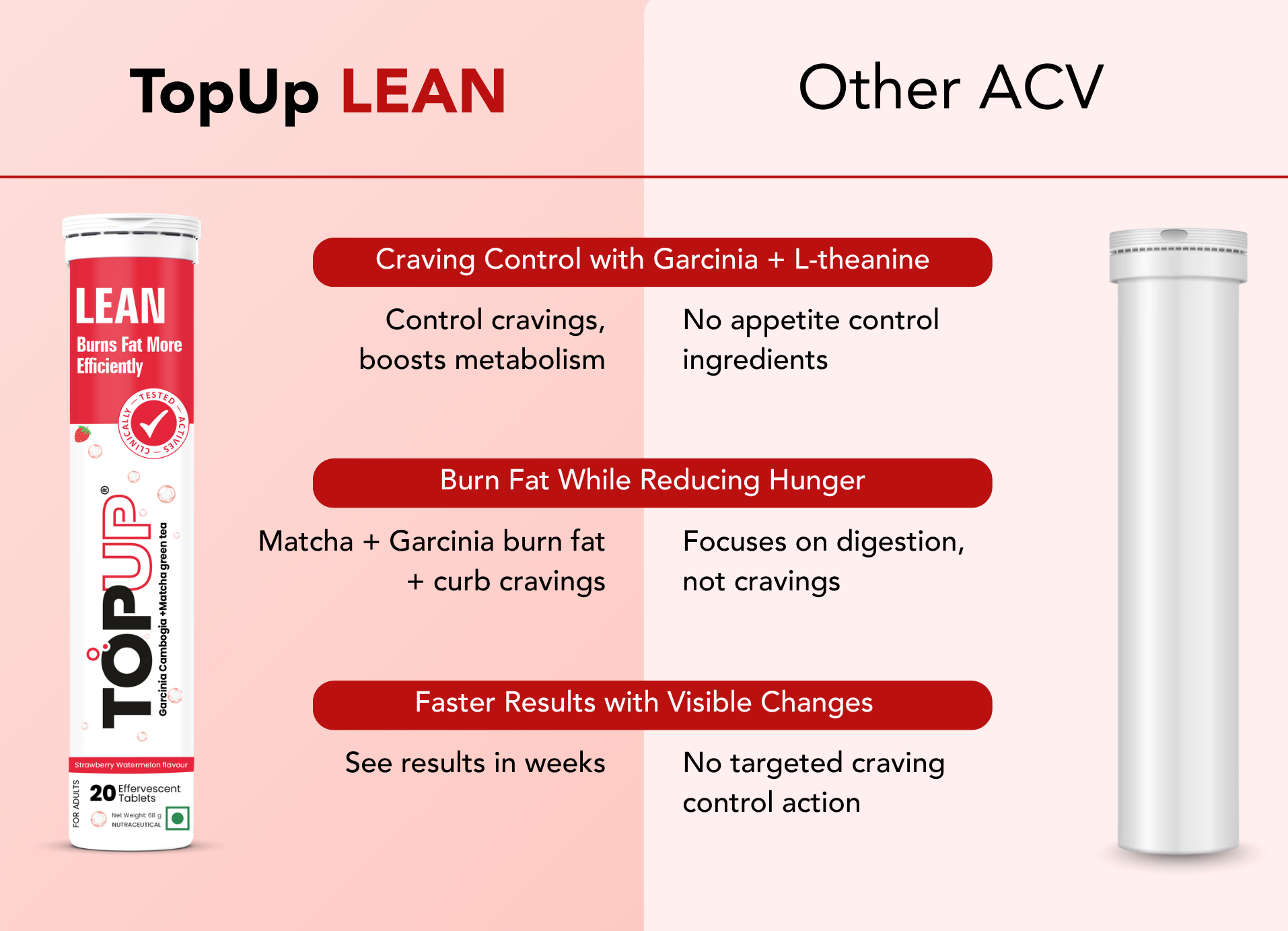 Topup Lean is a clean, plant-powered effervescent drink designed to support healthy weight management—without stimulants or stress. With powerful ingredients like Garcinia Cambogia and Matcha Green Tea, it helps curb cravings, boost metabolism, and sharpen your focus—ideal for your active, busy lifestyle.