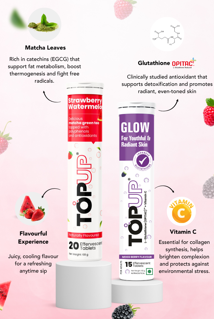 Topup Glow combines Glutathione and Vitamin C, two powerful antioxidants known for their skin-brightening and anti-aging properties. Unlike other skin tablets, it not only enhances skin radiance but also strengthens immunity, providing a holistic approach to skin and overall health.