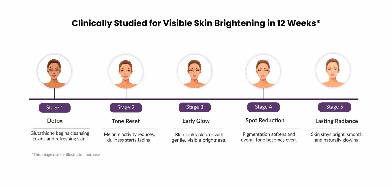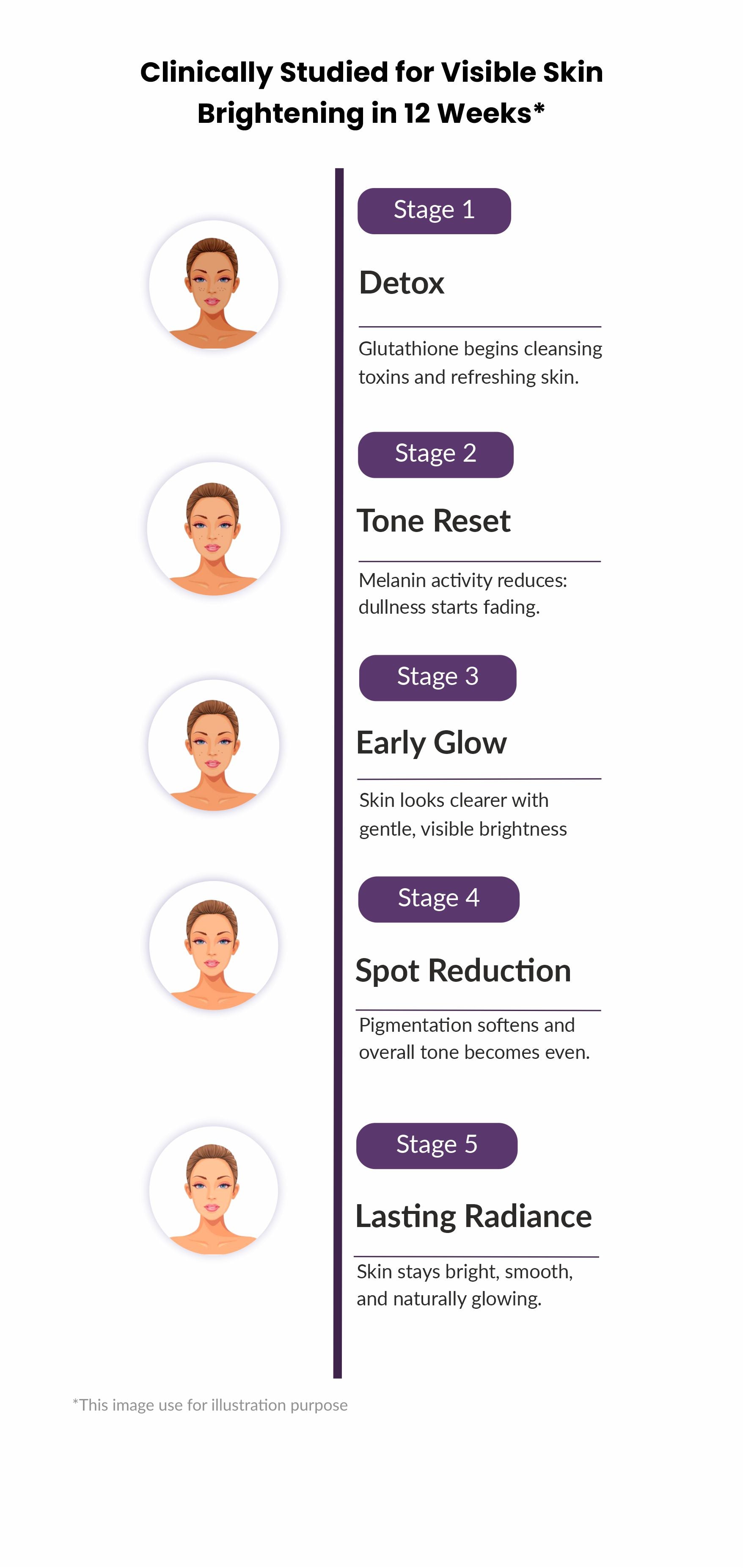 In a human clinical trial published in the Journal of Cosmetic Dermatology, reduced glutathione supplementation led to a steady increase in skin brightness, with a notable jump after Week 8 and peak radiance at Week 12.